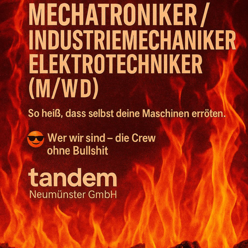 tandem Personallogistik Neumünster GmbH. Seit über 20 Jahren bringen wir Technik‑Talente dahin, wo’s knallt – im positiven Sinne. Wir sind nicht die, die dir erzählen, wie „familiär“ alles ist und dann kriegst du ’nen Klappstuhl. Wir sind die, die liefern. Punkt.
